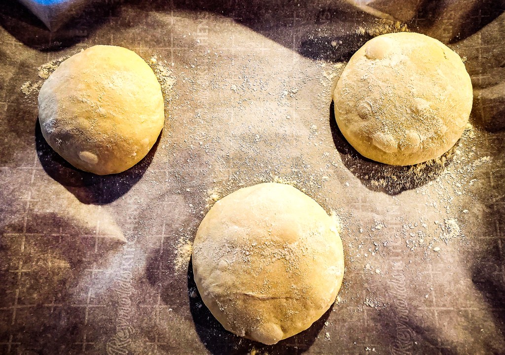 Ken Forkish’s recipes for pizza dough are written to yield enough dough to cook 5 pizzas. But since I wasn’t sure whether the dough balls were meant to be frozen, and refrigerator storage was recommended for only a few days, I thought I’d cut the recipe in half and make only 3 (slightly smaller) pizzas.