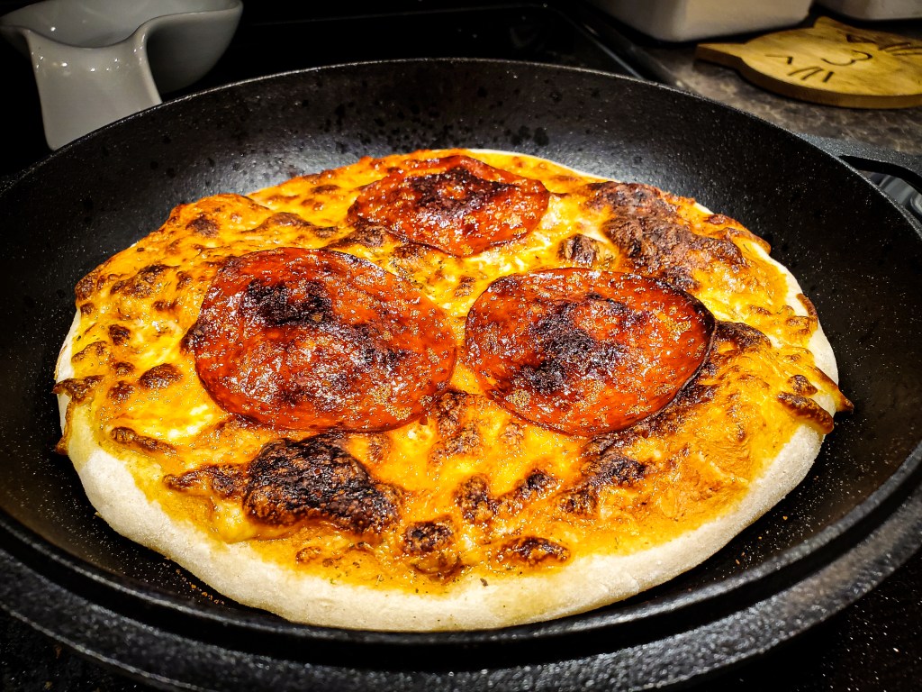 Since I don’t have a pizza stone (yet!!) I used my cast-iron skillet to bake up the pizzas.