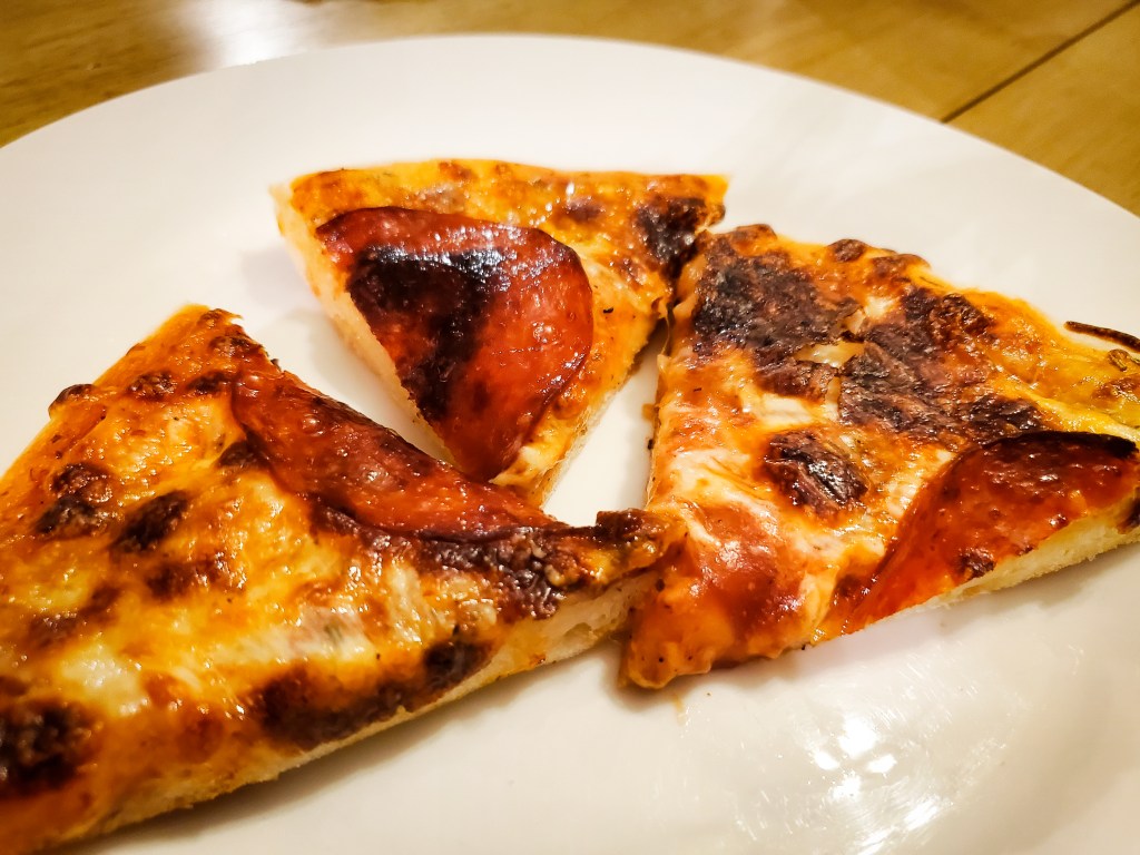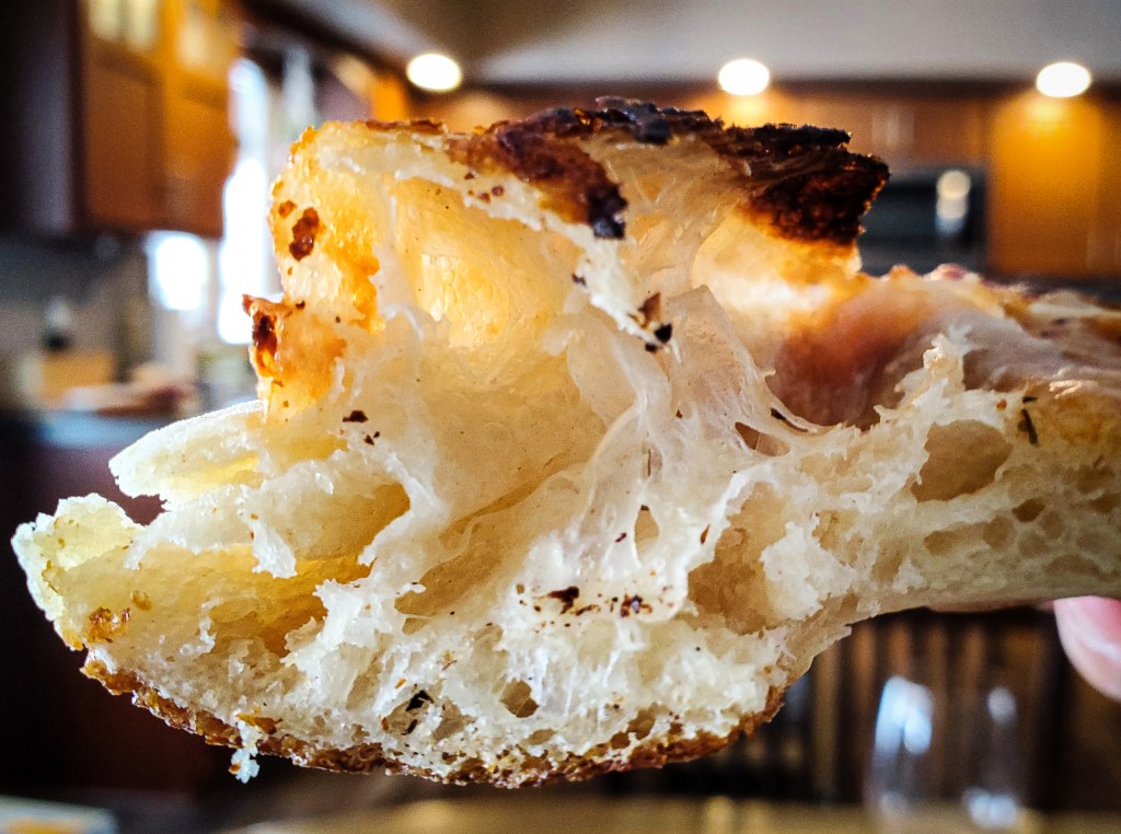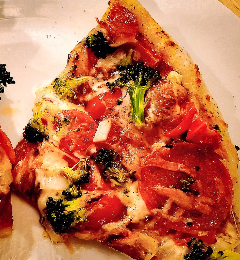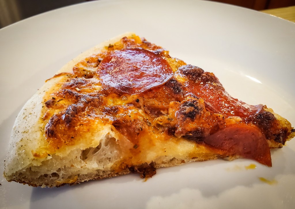 The third pizza, made two days later, I think was the best. Letting the dough develop over a couple of days gave the crust just a bit more tang, closer to a sourdough flavor. I predicted that this would gas up higher than the second pizza, so I tried to pierce some of the bubbles I noticed were starting to form before putting into the oven. And in addition to pepperoni, I added onions, grape tomatoes, and broccoli (to my half). The crust was delightfully fluffy on the inside and crispy on the outside, and overall, the result was delicious!