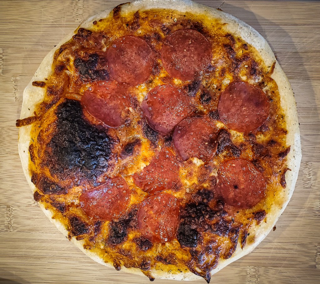 The first pizza I made, the day the (overnight) dough was ready, might have been slightly underdone as the crust was not as crispy or browned as I would have liked and came out rather flat. (The toppings look well done because I broiled for the last 2 minutes of cook time).